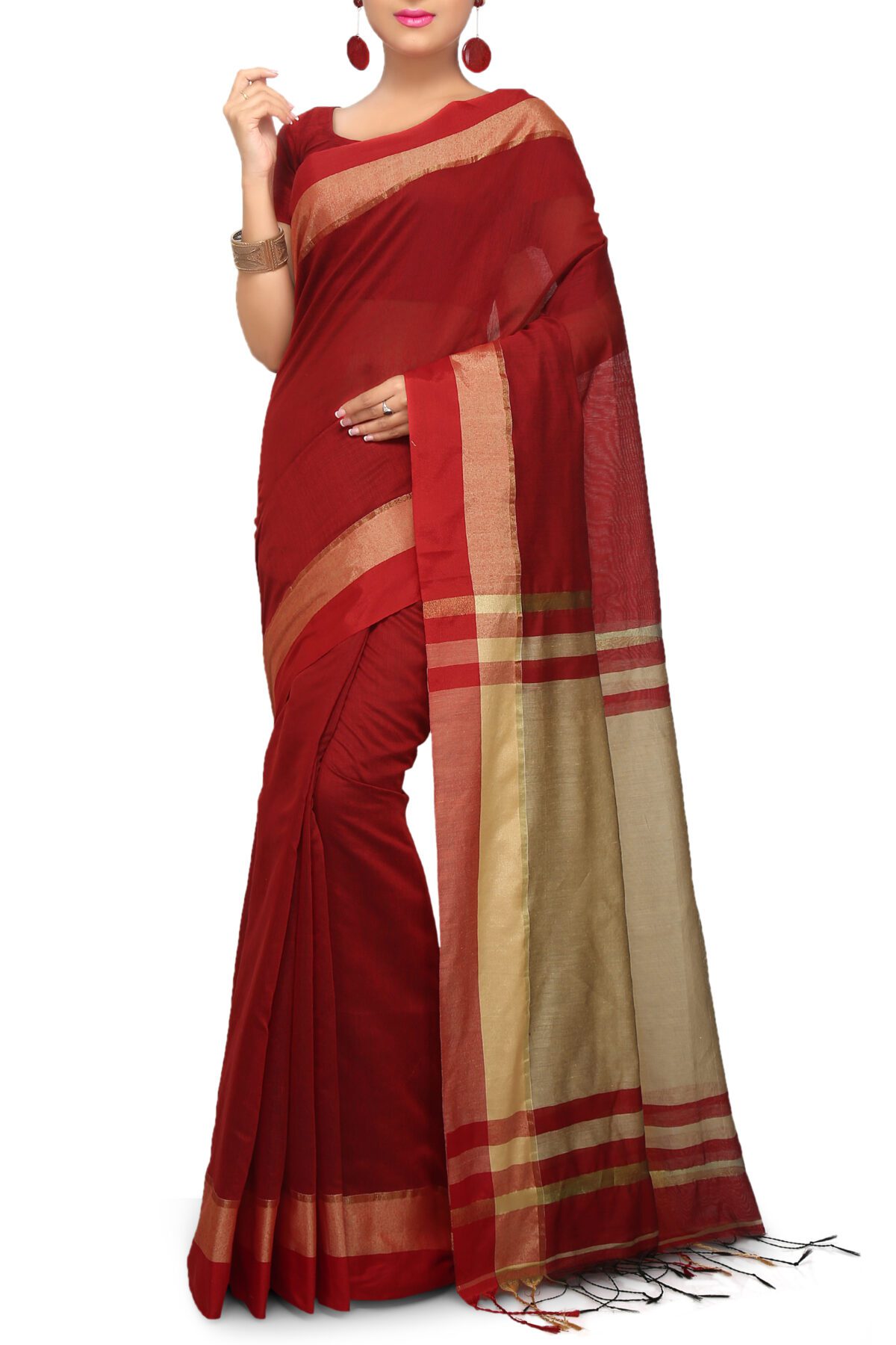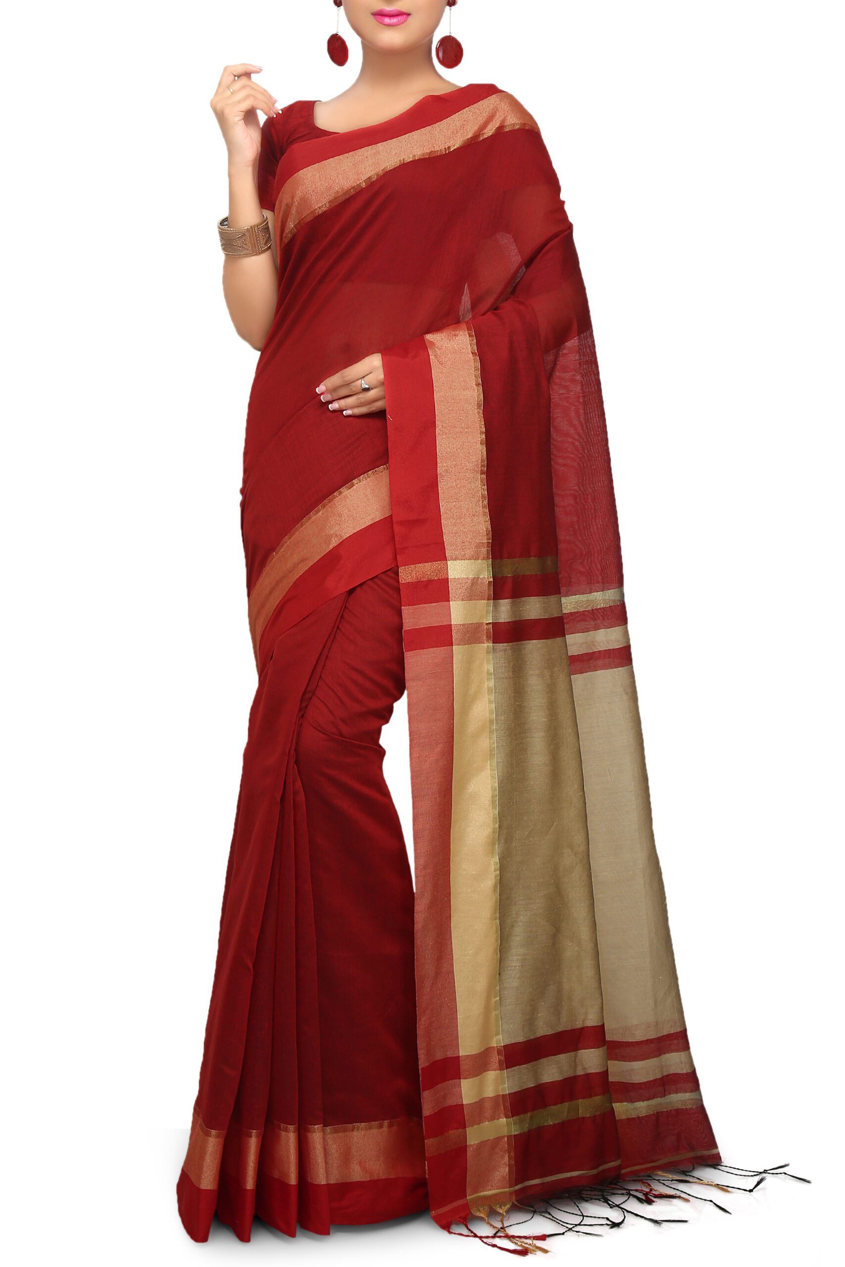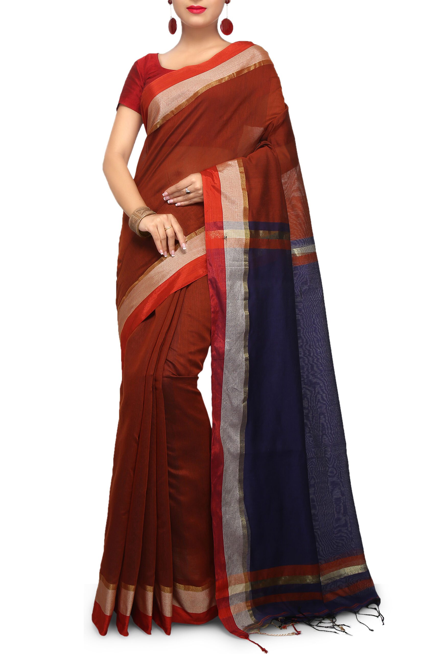 Handwoven; Comes with Handwoven Work. Material: Dhakai Jamdani. Best Dhakai Super Saree Without Blouse Piece. This Cotton is with Soft Saree so, it is a Dhakai Super saree. Saree length is 5.5 meter and Width is 1.2 meter.