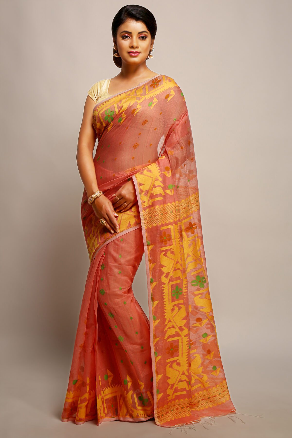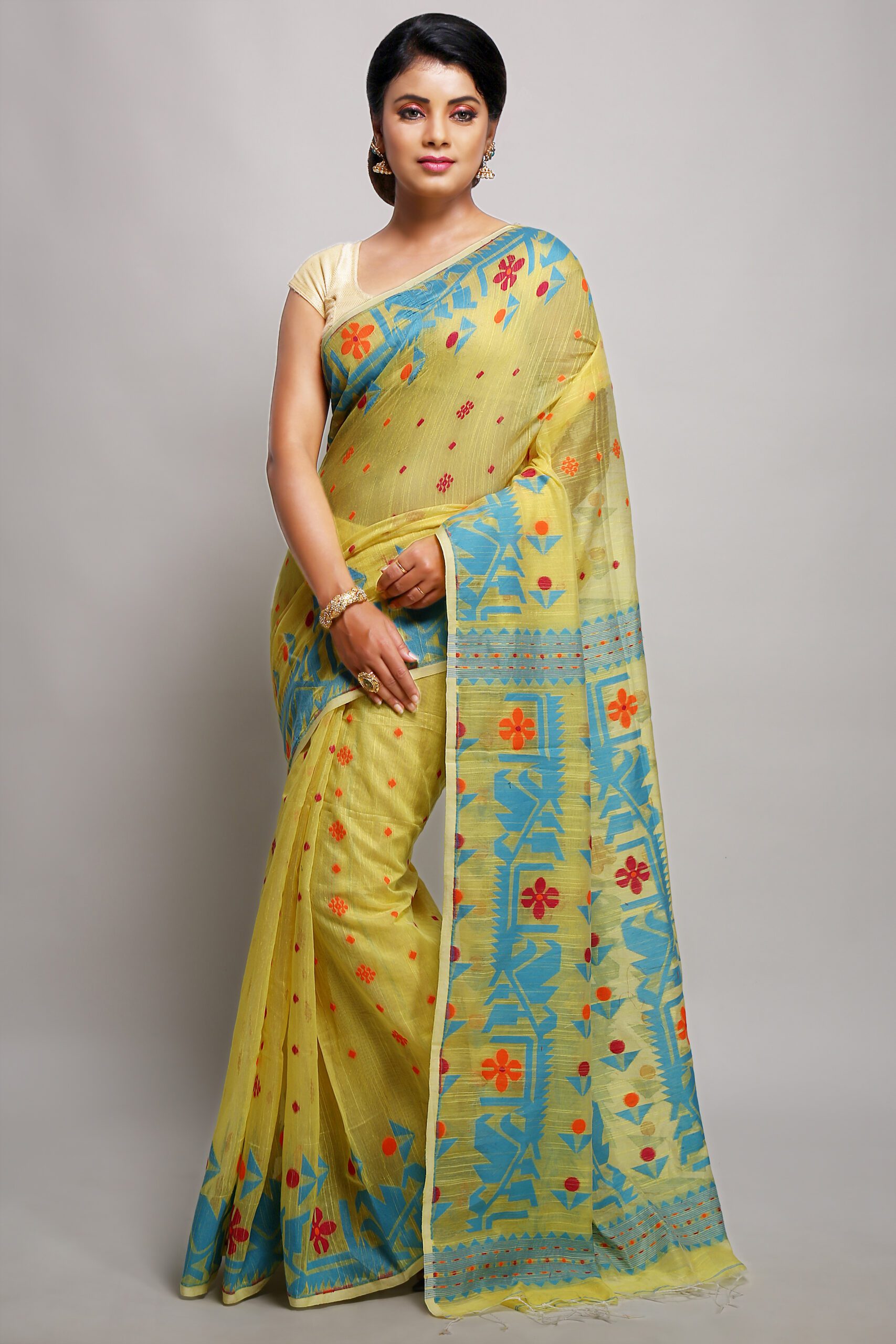Handwoven; Comes with Handwoven Work. Material: Dhakai Jamdani. Best Dhakai Super Saree Without Blouse Piece. This Cotton is with Soft Saree so, it is a Dhakai Super saree. Saree length is 5.5 meter and Width is 1.2 meter.